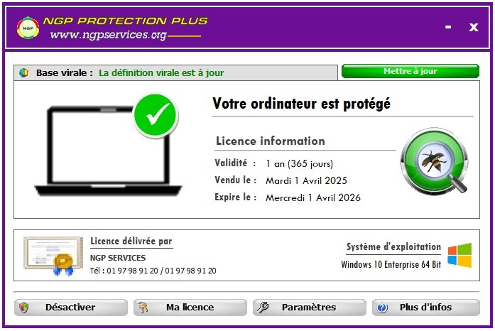 L'Antivirus NGP est la solution idéale qui protège votre ordinateur contre les virus informatiques. De nos jours, quelque soit votre domaine d'activité, il est impossible de se passer de l'usage des clés USB. Alors que les clés USB constituent de véritables sources de propagation de virus informatiques. Par conséquent, en maintenant votre ordinateur protégé d'une part, l'antivirus NGP le rendra également invulnérable contre toutes formes d'infection virale via clés USB. Contrairement aux autres antivirus qui existent sur le marché, l'antivirus NGP ne nécessite aucune connexion internet pour son installation. De plus, la taille de l'antivirus NGP est très légère. Ce qui vous permet de le télécharger très rapidement et le transporter via n'importe quel support. Comme tout antivirus professionnel, la validité de la licence de l'antivirus est de 365 jours. Ce qui équivaut à 1 an de protection renouvelable. Tant que vous n'aurez pas épuisé la totalité des 365 jours, vous n'avez pas de nouvelle licence à acheter. Ce qui signifie que même si vous perdez votre licence en cours de validité pour une quelconque raison (soit un maintenancier a reprogrammé votre ordinateur), vous avez à tout moment la possibilité de la récupérer (la licence) et continuer à jouir du nombre de jours restants.